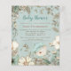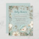 Convite para Chá de fraldas do Woodland Bear Boy. Um alternativo MENOR de 4,5" x 5,6", compatível com o orçamento. Disponível em um STOCK de PLACA SEMI GLOSS 110 lb ou um STOCK de PAPEL THINNER SATIN FINISH 80 lb. Os envelopes são um extra opcional. Este design de estilo vintage tem uma raposa fox que se espalha por trás das flores e folhagem. Você pode personalizar facilmente todo o texto de acordo com suas necessidades. Um fundo azul de pó coordenado está atrás.