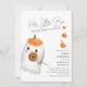 Um convite para o chá de fraldas de Halloween super bonito com um fantasma adorável. A Tipografia diz que seu pequeno boo chegará em breve! Isto é perfeito para o seu chá de fraldas de tema de halloween. Veja a coordenação de itens no nosso compro, Encantado Finch.