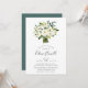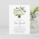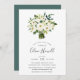 Os elegantes convites para bebês florais apresentam um buquê de rosas brancas de cor aquosa e peônias com folhas e folhagem botânica verde-esbranquiçada. Personalize com os detalhes do seu chá de fraldas abaixo em uma mistura de blocos, serifas e tipos de caligrafia.