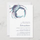 O convite para chá de fraldas chic costeiro apresenta uma ilustração de caranguejo azul-aquarela estilo vintage, com os detalhes do seu chá de fraldas em azul-marinho clássico. Perfeito para chás de fraldas de praia, verão ou tema náutico, esses convites de estilo costeiro revertem para o azul de porto sólido.