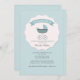 Um convite de chá de fraldas encantador em tons de azul e branco. Ele apresenta um medalhão escaldado no centro com uma carruagem e uma fita que diz "É um menino".