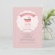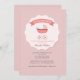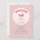 Um convite de chá de fraldas encantador em tons de rosa e branco. Ele apresenta um medalhão escaldado no centro com uma carruagem e uma fita que diz "É uma menina".