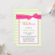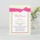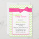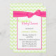 O convite para o chá de fraldas do Na moda foi feito em um padrão de ziguezague branco e verde claro. Os gráficos de uma área de texto branco de borda cor-de-rosa, no meio, têm uma faixa e um arco rosa bonito, no topo. A parte de trás é feita no mesmo padrão de chevron, com outra área de texto branca, na parte inferior. Personalize todo o texto, de frente e de volta para atender às suas necessidades de evento.