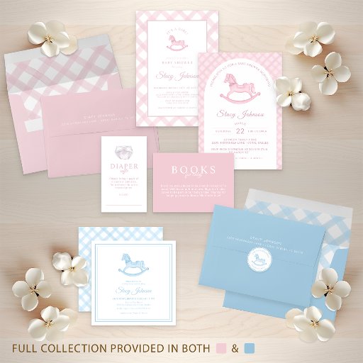 Celebre uma nova chegada com este elegante convite de chá de fraldas de cavalo azul de balanço. Projetado com uma borda suave de gingham e quadro clássico, este estilo tradicional é perfeito para um chá de fraldas de menino. Personalize com seus detalhes um convite para eternos que a família e os amigos apreciarão. 👉 Ver designs de chá de fraldas mais tradicionais em nossa Coleção de Meninos Clássicos (copie e cole este link no seu navegador):https://www.zazzle.com/collections/119611863398279099