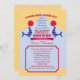 Trendy e um convite para um circo. Apresenta duas focas fazendo um circo com bolas. Uma forma de tenda no fundo adiciona ao tema. Cores brilhantes e fonte típica de circo. Este convite brincalhão é um design unisex ideal para qualquer gênero. padrões diferentes adicionam um talento moderno. Adicione seu próprio texto.