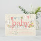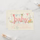 Chamada de bebê bebezinho com coelhinhos com flores coloridas, feita em um fundo popular de creme. Um convite bonito para um chá de fraldas de meninas.
