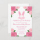 Esta design feminina apresenta lindas rosas e peônias cor-de-rosa e um belo e sorridente rosto para um chá de fraldas.