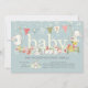 O convite para meninos bebês com coelhinhos com flores coloridas foi feito em um popular fundo azul. Um convite bonito para um chá de fraldas de rapazes.
