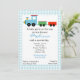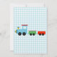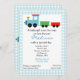 Um convite para chás de fraldas bonito feito em tons de azul e branco. A frente tem um fundo de gingham azul e branco. Um trem de brinquedo azul fica no topo. Você personaliza o texto. As costas têm o padrão de gingham azul com uma versão maior do brinquedo. Perfeito para qualquer chá de fraldas para um bebê.
