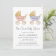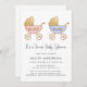 Celebre a futura mãe de uma menina e gêmeos com este convite de chá de fraldas bonito com cores de água rosa, azul e douradas, retrógradas, de carruagems de bebês com "É uma garota!" e "É um rapaz!" escrito em (você pode personalizar este texto ou deixar vazio). "É um Chá de fraldas Gêmeos" é escrito por baixo de um roteiro de na moda.