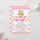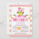 Convite moderno para chás de fraldas de coruja, com uma coruja fofa colocada sobre um fundo de faixa rosa e branca, com sotaque de sol e flor sorridente e banners de pingente. Sacudir nosso chá de fraldas de garotas convidarem para ver um toque especial. Perfeito para um chá de menina do tema coruja.