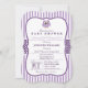 É uma garota! Chá de fraldas de coruja roxa, lavanda entre pernas elegantes, convida para faixas verticais roxas e padrões de bolinhas roxas escuras e brancas com aparência formal vintage. Excelente para chás de fraldas temáticos de coruja; perfeito para chás primavera. Convite de forma de colchete retrô.