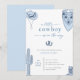 Um pequeno vaqueiro está a caminho 🤠 Nossos modelos de convite para chás de fraldas de cowboy azul-de-JY são a forma perfeita de celebrar o novo menino a caminho com um chá de fraldas temático ocidental. Perfeito para um chá de fraldas de menino, estes convites para chás de fraldas de vaqueiro são a escolha perfeita. O chá de fraldas LEVI, um pequeno cowboy convidado, apresenta um fundo branco brilhante com cowboy e elementos ocidentais em tons de azul como uma bandana, um chapéu de cowboy, cacto, ferraduras e botas de cowboy, aliado à frase 'um cowboy está a caminho' usando um roteiro manuscrito, serif e sans serif fonts em azul para acrescentar interesse visual ao seu convite para o chá de fraldas ocidental. Personalize este convite para chá de fraldas de vaqueiro adicionando nomes, data, hora, local e outros detalhes. chá de fraldas de vaquinha, pequeno vaqueiro está a caminho, convites para chás de fraldas de vaqueiro, convite para chá de fraldas de vaqueiro, convite para chá de fraldas de vaqueiro, convite para beberrinho de vaquinha, convite para vaqueiro