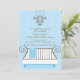 Comece seu evento bem com nosso convite elegante e na moda Chá de fraldas apresentando um berço de bebê com um cobertor de bebê inicial monogramado em um fundo azul claro com um candelabro marrom. Na moda e convite para um Chá de fraldas moderno para um bebê. Apenas personalize com suas informações e você está pronto para ir! Itens correspondentes, incluindo chás de fraldas postais, adesivos de favoritos, cartões de agradecimento e obrigado que você também está disponível em nosso compro. ©Blackleaf Studio