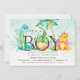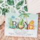 O convite para chá de fraldas de menino temático Dinossauro apresenta três dinossauros. Voltar a convidar tem um padrão verde tropical.