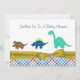 Dinossauros coloridos brilhantes decoram a frente deste convite de chá para bebês, com uma banda de xadrez colorida correspondente, na parte inferior e gráficos de uma fita e arco amarelo de ouro. O texto do script azul federal diz: "Sigam-Nos A Um Chá de fraldas". O verso do convite tem o plano de fundo do padrão de xadrez, com uma área de texto azul esboçada, no meio. O texto em preto e azul é totalmente personalizável para atender às suas necessidades de eventos para bebês. Excelente chá convite para um bebê.
