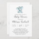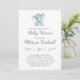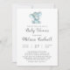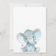 O convite para chás de fraldas e bonitos apresenta um elefante para bebês a cores aquáticas. As cores incluem: branco, azul-bebê e cinzas. Ideal para um chá de fraldas safari ou primeiro aniversario safari.