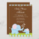 Comece seu chá de fraldas de bebê, chá de fraldas de menina ou chá de fraldas neutro com nosso belo convite para chá de fraldas de elefante. Nossa na moda e convite moderno apresenta um adorável elefante bebê azul com elefante-mãe colocado em um fundo marrom-tenda com uma borda de faixa. A parte de trás do nosso convite para chás de fraldas de animais da selva de elefantes apresenta um fundo castanho moderno e moderno. Visite o nosso compro para uma grande seleção de convites para chás de fraldas para rapazes, raparigas ou um chá de fraldas neutro em termos de gênero. ©Blackleaf Designs