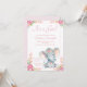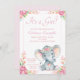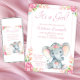 Bebê elefante convida com elefante de aquarela adorável com flores rosa bonito em sua cabeça sobre um fundo floral de ponto rosa bonito. Esses bonitos convites para bebês elefantes são facilmente personalizados para seu evento simplesmente adicionando seus detalhes.