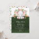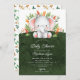 Design de chá de fraldas de safari da selva de aquarela branca apresentando um elefante adorável com folhas da selva sobre um fundo verde escuro. Perfeito para um chá de fraldas de meninas, chá de fraldas de meninos ou chá de fraldas neutro em gênero. Visite nosso compro para ver este design com animais individuais.