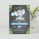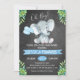 Este convite para o chá de fraldas de elefantes em outdoors apresenta um elefante giro e alguns balões sobre fundo de quadro de chanfrado. Os cantos do convite apresentam uma folhagem tropical verde. Também incluí um banner azul no design. O convite de chá de fraldas deste rapaz está pronto para ser personalizado. Para mais convites para o chá de bebê com tema de elefante, visite a loja.