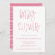 Um simples convite para chás de fraldas cor-de-rosa e branco com "chá de fraldas" em letras grandes cor-de-rosa, em um fundo branco. O reverso está em rosa-bebê com listras brancas.