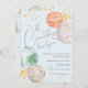 Adorável convite para chás de fraldas espaciais com planetas pastéis, lua, estrelas e sotaques de ouro falsos. Perfeito para um chá de fraldas temático da galáxia espacial.