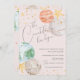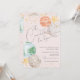 Adorável convite para chás de fraldas espaciais com planetas pastéis, lua, estrelas e sotaques de ouro falsos. Perfeito para um chá de fraldas temático de galáxia espacial menina.