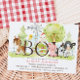 Convite para chás de fraldas de fazenda temático com animais de exploração. A parte de trás do convite tem um padrão de gingham vermelho.