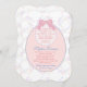 Design de CHÁ DE FRALDAS de Garota do Bebê Chic apresentando uma forma de bib PINK com uma fita cor-de-rosa sobre um fundo de pontos flutuantes de cor d'água macia! Use a ferramenta Personalizar para adicionar suas informações. Para obter mais informações, visite a coleção de convites BABY SHOWER para mais ideias!