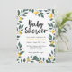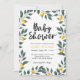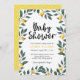Convide seus hóspedes para o seu chá de fraldas com este convite para Chá de fraldas de limão com uma folha de limão de aquarela e um fundo com padrão. Perfeito para qualquer evento de verão!
