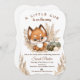 Um filhote está a caminho. Queda, outono, Pequeno Chá de fraldas de raposa, convite com uma raposa de bebê, abóboras e pampas. Chá de fraldas de convite para modelo totalmente editável.