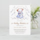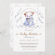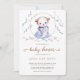 Um lápis colorido ilustrado por uma ursinha vestindo um vestido azul e segurando um cachorro branco decora este convite de chá de fraldas branco, bonito e elegante para uma futura mamãe.