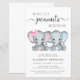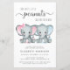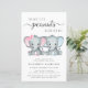Um belo convite para gêmeos e chás de fraldas, amigável em orçamento, com "Dois Pequenos Amendoins Doce Estão A Caminho" escrito em tipografia de cinza mole e roteiro de na moda, e aquarelas azuis e cor-de-água rosa pastel de elefantes bebês. Personalize o nome da mãe e os detalhes do chá em uma simples tipografia de cinza.