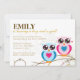Chá de fraldas De Garoto E Garota Gêmeos. Um convite para chás de fraldas de excelente com duas corujas com corações invertidos no meio delas e olhos enormes. Uma coruja é azul com um coração cor-de-rosa e a outra coruja é rosa com um coração azul. Estas corujas de bebê sentadas no rico florescem ramificações que seguram flores e folhas. Este convite para chás de fraldas de coruja tem um fundo colorido de creme com elementos florescentes sutis nele. Correspondência cartões de agradecimento e etiquetas disponíveis