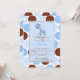 Convite para Chá de fraldas Adorable Boy apresentando uma girafa azul giratória em um fundo de bolinhas azul e marrom apenas para um chá de fraldas de criança. Perfeito para um chá de fraldas de selva, chá de fraldas de safari ou para uma parte temática do chá de fraldas de zoo. Itens correspondentes disponíveis em nosso compro. Perfeito para um chá de fraldas de bebê. ©Stockberry Studio