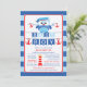 Convite moderno para chá de fraldas ousado e brilhante para veleiros, com uma coruja marinheiro fofa colocada sobre um fundo azul de faixa com um farol e sotaque vermelho e faixas de pendante. Sacudir nosso chá de fraldas de veleiro convidando para ver uma correspondência de volta para um toque especial extra. Perfeito para um pequeno chá de fraldas marinheiro