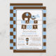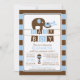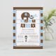 Convite moderno para chá de fraldas de elefante com um elefante-mãe fofo com seu elefante bebê colocado em um fundo de faixa azul e castanha escura com sotaque chocante e banners de pingente. Sacudir que o chá de fraldas dos nossos rapazes convide para ver uma correspondência para um toque especial extra. Perfeito para um chá de filhinho temático do elefante.