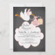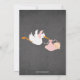 Um convite para chá de fraldas de bebê de quadro negro bonito com uma cegonha voadora segurando um pacote de bebê rosa com uma nuvem enorme em um quadro negro. A parte de trás do nosso convite apresenta uma cegonha que combina com uma menina Visite nosso compro para ver este convite para chás de fraldas de meninos na lousa em escolhas populares de tamanho e para combinar adesivos de chá de fraldas, obrigado a anotar cartões e selos postais. ©JW Illustrações bla