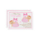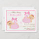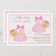 Um convite bonito com meninas gêmeas em pacotes cor-de-rosa com grandes arcos. O fundo enquadrado tem flores rosa sobre uma base branca.O cartão é fácil de personalizar com seu texto, fonte, cor da fonte e escolha de seis tipos de papel.