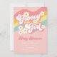 Oh Baby Retro Chá de fraldas Invitation com fundo boho, flores margaridas dispersas, arco-íris, e as palavras "groovy girl" na fonte do rancho 70. Sacudir nosso doce convite para ver um azul de volta.