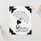 Um convite com cantos antigos de fotos em preto, tanto na frente quanto no verso. O design consiste de um guarda-chuva preto e branco com um padrão de texto "bebê" e um arco preto na alça. O texto abaixo diz "Chá de fraldas". Personalize o texto do lado oposto com detalhes do evento. Procure variações deste convite e outros itens correspondentes na categoria "Baby" de Paperie de Jill.