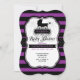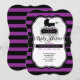 Um convite de chá de fraldas de Halloween com listras roxas e pretas, uma carruagem de bebê e teias de aranha.