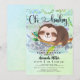 Convite para chá de fraldas de cor branca, com uma pequena preguiça doce, com aquarela e brilho num fundo quente