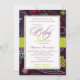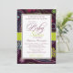 Este convite para chás de fraldas na moda tem um doce roxo de ameixa escuro, azul-aqua e flores de verde limão e design de paisley no fundo. No meio, há uma banda verde limão. No centro, você pode personalizar facilmente as informações do chá de fraldas. Com as cores do convite, seria adequado para um chá de menina.