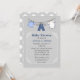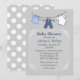 Na moda chá de fraldas convite feito em um fundo de cinza leve. Gráficos de uma linha de roupas com pequenas roupas azuis penduradas, decoram o topo do convite. Um quadro decorativo branco transparente, no meio do convite, tem texto de cinza azul e escuro pronto para personalizar. A parte de trás é feita em uma cinza com bolinhas brancas. Muito na moda e convite para chás bonitos.