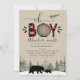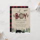 chá de fraldas de inverno doce, com silhuetas de urso, pinheiros, neve, papel falso Kraft e um flanela de padrão de xadrez de búfalo. O mesmo design também está disponível com a palavra bebê em vez de menino.