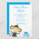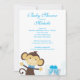 Comece seu chá de fraldas de bebê com nosso convite para chá de fraldas de macaco. O convite é um adorável macaco bebê. Nosso convite para chás de fraldas de macacos-bebê safari apresenta o macaco mais bonito com um presente de chá definido em um fundo branco nítido. O convite para chás de fraldas de macacos-selva contém um fundo azul correspondente. Visite nosso compro para uma grande seleção de convites para chás de fraldas para meninas, garotos e chás de fraldas neutros. ©Mujka Design
