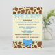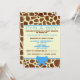 Um convite de chá de fraldas com um fundo de impressão de girafa na frente e atrás. A frente apresenta arco azul e vermelhos na parte inferior. Personalize o texto azul e marrom no centro com detalhes de sua ocasião. Procure outros itens de impressão de girafa na Paperie da Jill.
