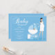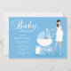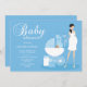 Um convite de chá de fraldas com uma mulher de cabelos pretos ao lado de presentes.